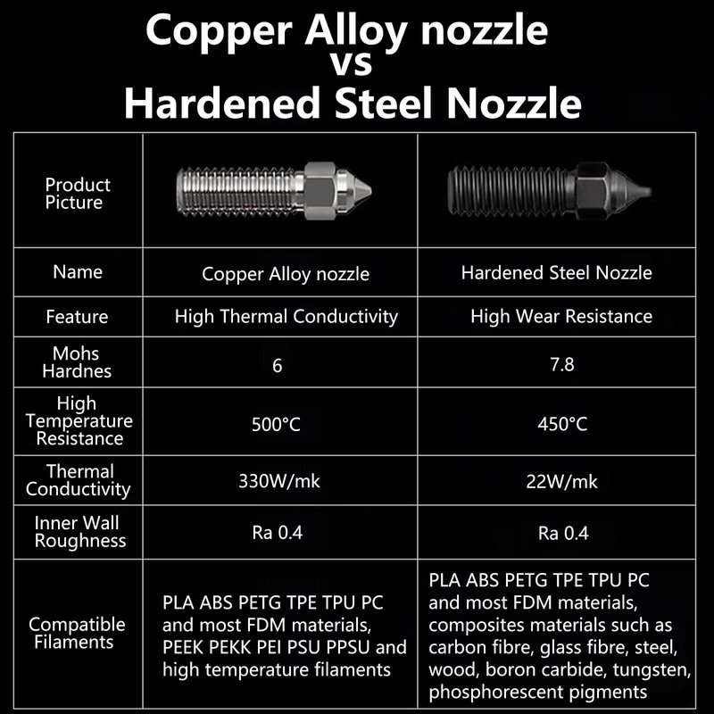 - Wide Compatibility - The 3D Printer Hardened Steel Nozzles is suitable for most FDM materials such as PLA, ABS, PETG, TPE, TPU, PC, etc., and composite filaments with grinding additives such as carbon fiber, glass fiber, steel, wood, boron carbide, tungsten, phosphorescent pigments, etc.