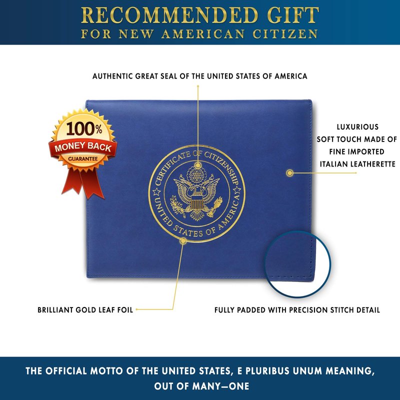 Proudly Designed in the U.S.A. by descendants of immigrants and a U.S. Navy veteran, our certificate holder embodies the essence of the American dream. Meticulously crafted with luxurious Italian vegan leatherette, it's fully padded, machine-stitched, and features the authentic Great Seal of the United States in gold leaf foil. Protect your citizenship certificate with an Official Fellow Citizen holder, a cherished keepsake. Why Choose Us? Our certificate holder is more than a cover; it's a testament to your American journey. Choose quality, heritage, and pride. Embrace Your American Dream with Official Fellow Citizen.