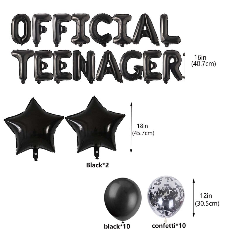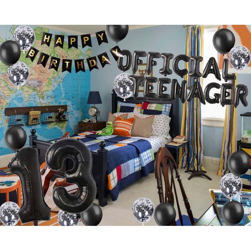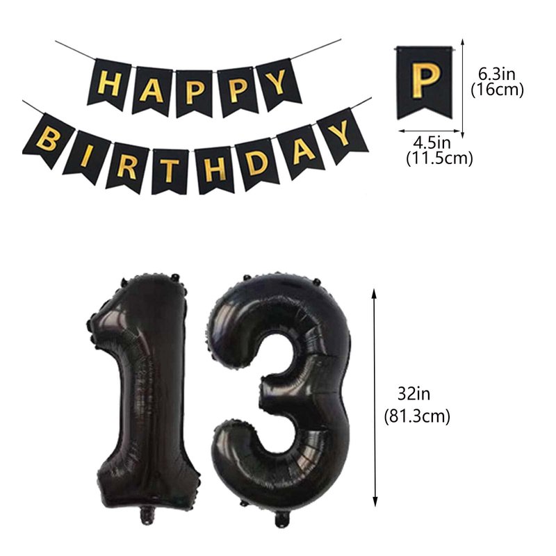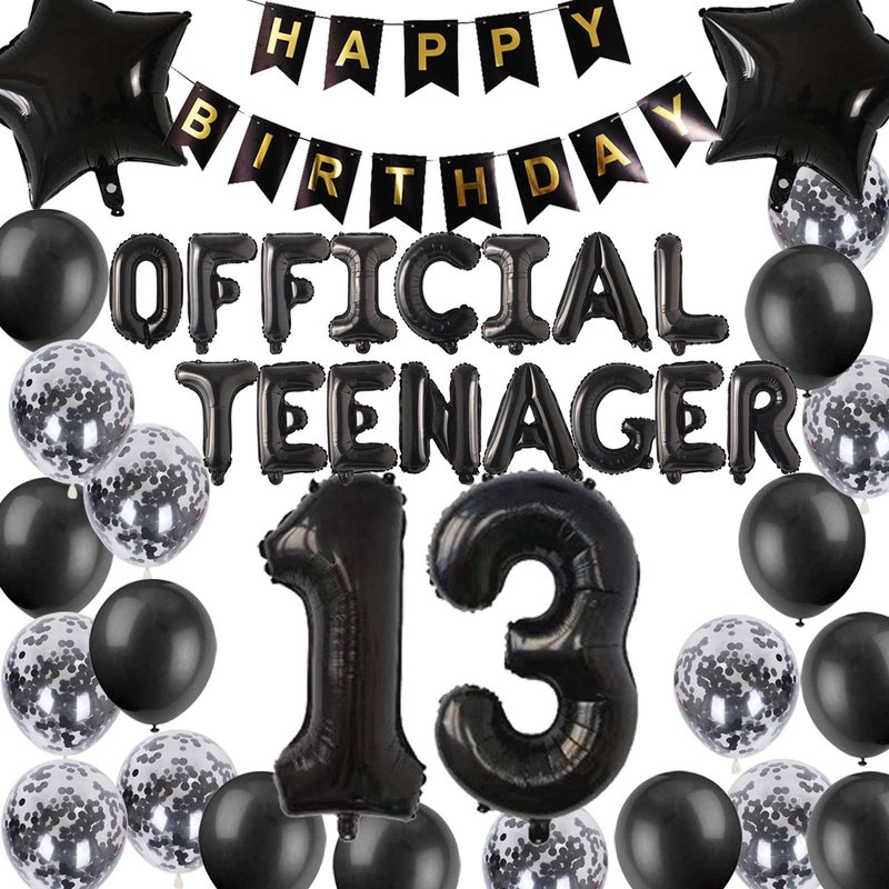 - Official Teenager 13th Birthday Black Decorations include: 1 * Black Gold"HAPPY BIRTHDAY" Letter Banner, 1 * Black Official Teen Letter Balloons Banner in separatly, 1 * Number 13 Balloons, 2 * Star Foil Balloons in Black Colours, 20 Latex Party Balloons in 4 styles (10 * Black Confetti, 10 * Black), 1 * 10m Ribbon. A total of 27 packs in one package.