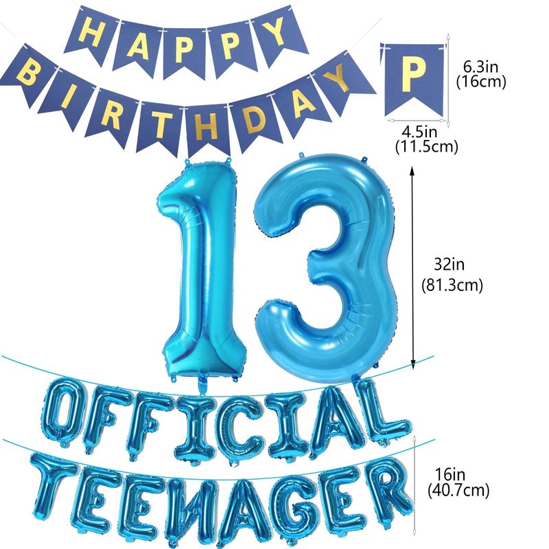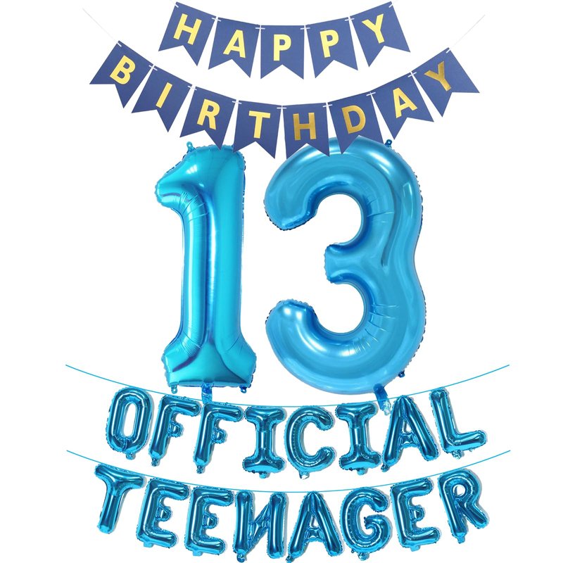 - Package included: 1* 'HAPPY BIRTHDAY' Bunting Banner, 1* Official Teenager letter foil balloons separately, 1* number 13 foil balloons, 1 ribbons, total 4packs in one packages.