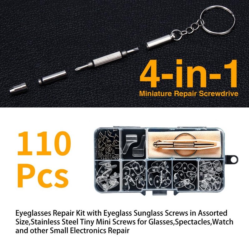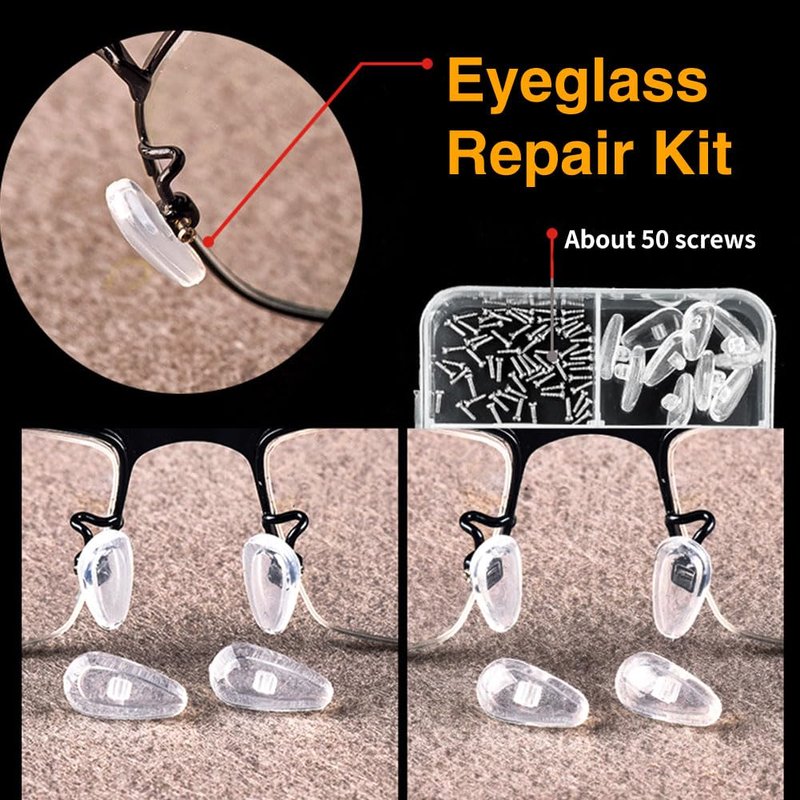 - đ¶ăSunglasses Repair Tool Kită: This eyeglass repair kit include a box of 50pcs eyeglass screws,70 pairs of eyeglass nose pads, 1 pair of ear hooks, 1 four-in-one screwdriver for glasses repairing, 1 tweezer, 1 glass cleaning cloth, 1 storage case, meeting all requirement of your glasses repair. It is a muti-function eyeglass repairing kit.
