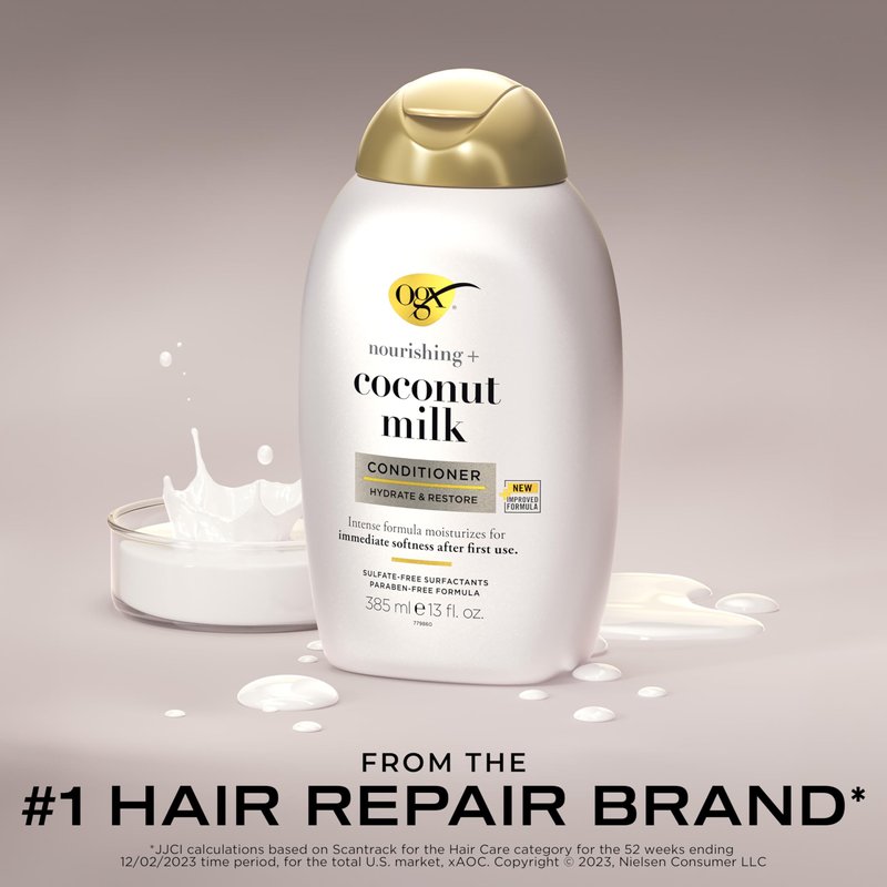 - HYDRATE & RESTORE: This 13-fluid ounce bottle of OGX Nourishing + Coconut Milk Conditioner with an intensely moisturizing formula immediately softens hair after the first use & helps strengthen & hydrate dry, damaged, & frizzy hair