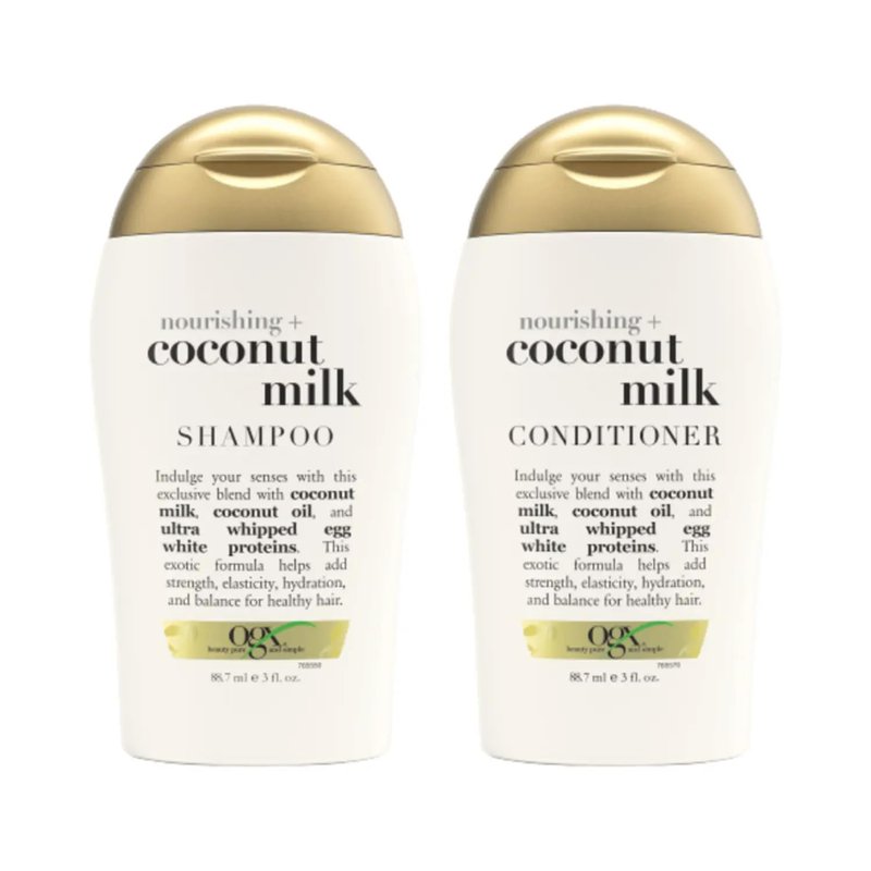 3 oz travel size, bundle of shampoo & conditioner Your hair will go nuts for this tropical ultra-creamy blend, infused with Coconut Milk, whipped Egg White Proteins and Coconut Oils. Expect hair with more natural strength and elasticity, super shine and a subtle scent of the tropics. How To Use: Apply shampoo generously to wet hair, massage into a lather through to ends, then rinse the hair thoroughly. After shampooing, follow with conditioner. Warning: Avoid contact with eyes. If contact occurs rinse immediately. For best results use in conjunction with other OGX products.