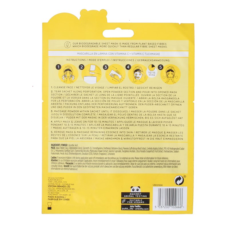 A fresh active ingredient mask powered for bright dewy skin. Our Vitamin C Biodegradable Mask uses a two step process to deliver the active at optimum freshness. Vitamin C is most stable when in powdered form and kept seperate in a split sachet to keep it from oxidating. A mask to help improve uneven skin tone and hydration. Vitamin C is also a great antioxidant, helping to protect the skin against environmental stressors during the day.
