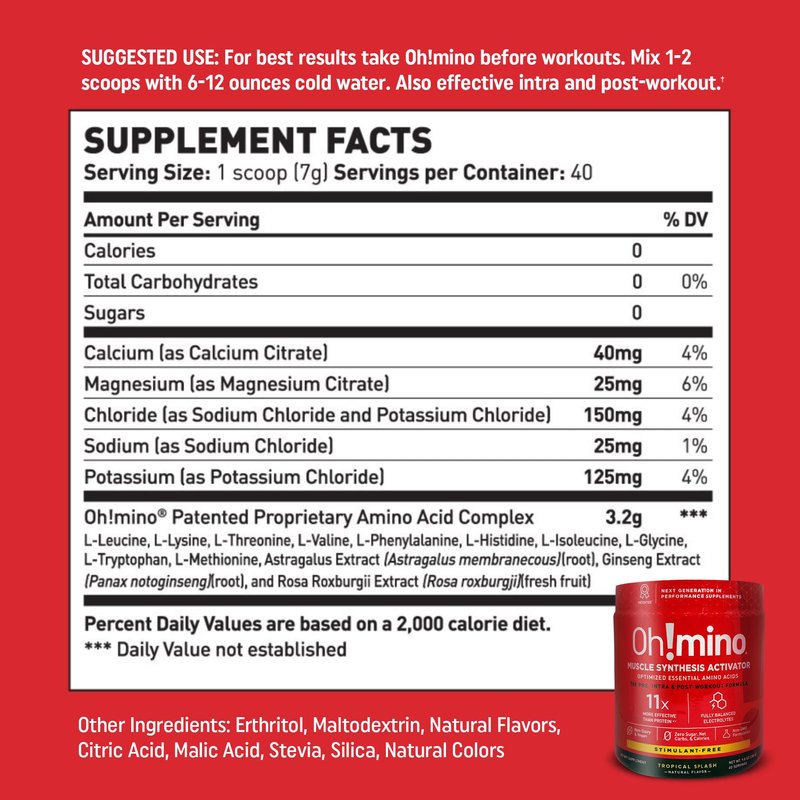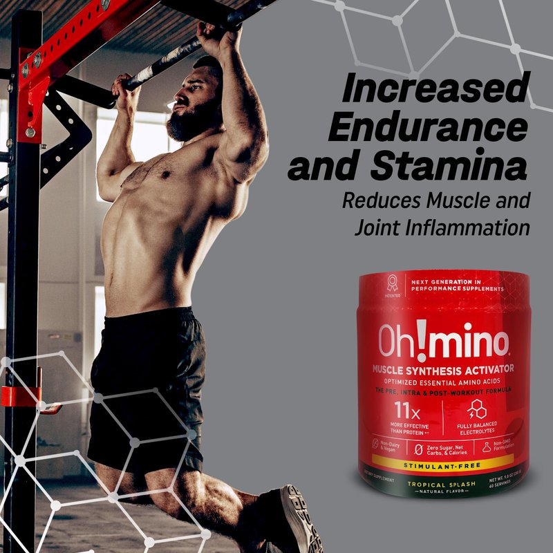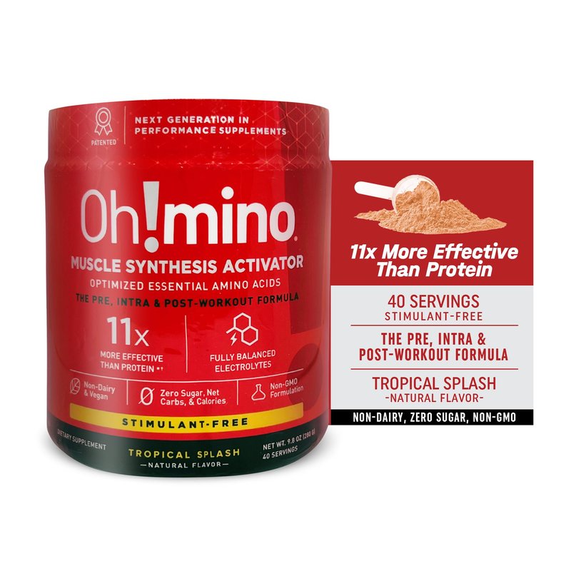 Oh!mino Amino Acid Energy Blend - Sugar-and-Stimulant-Free, Pre-Post Workout Powder, BCAA Amino Acids, Workout Recovery Drink, Muscle Synthesis Activator, Tropical Splash, 280 g, 40 Servings