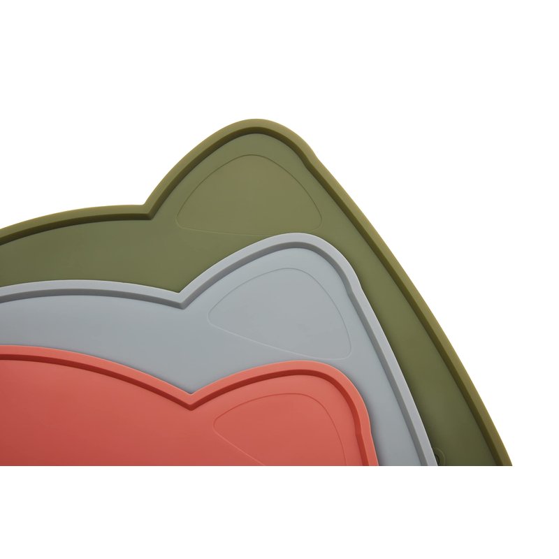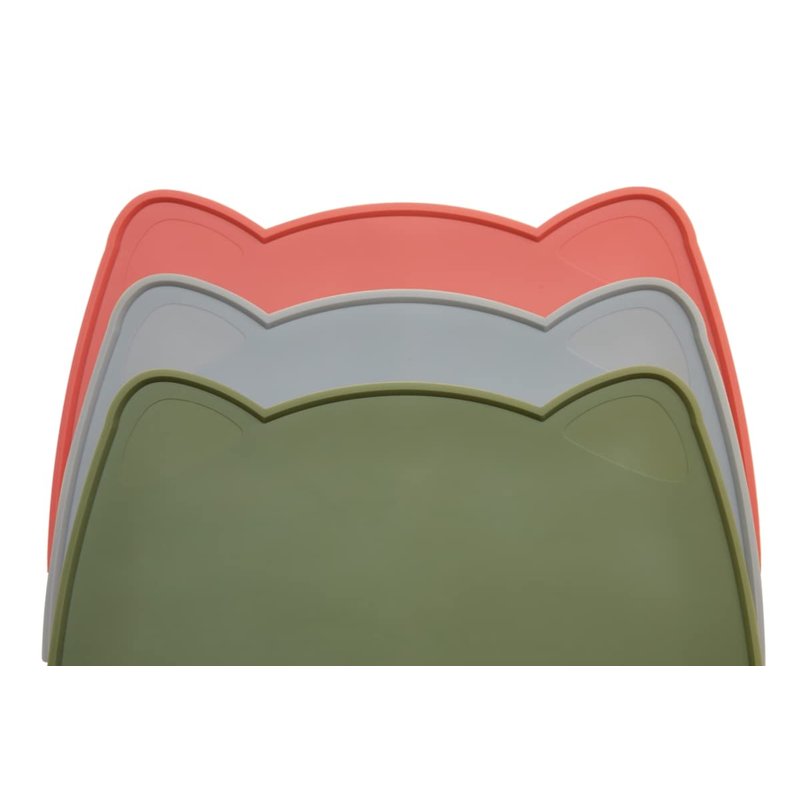 Dimensions: 18"x 9.8" x 0.25" (raised edges) Pet Feeder/Pet Food place mat Unique sleek, stylish design Dish-Washer friendly, easy to clean Anti-spill raised edges to contain food and water Waterproof for protection Anti-slip design for secure placement Flexible silicone material for easy storage and cleaning