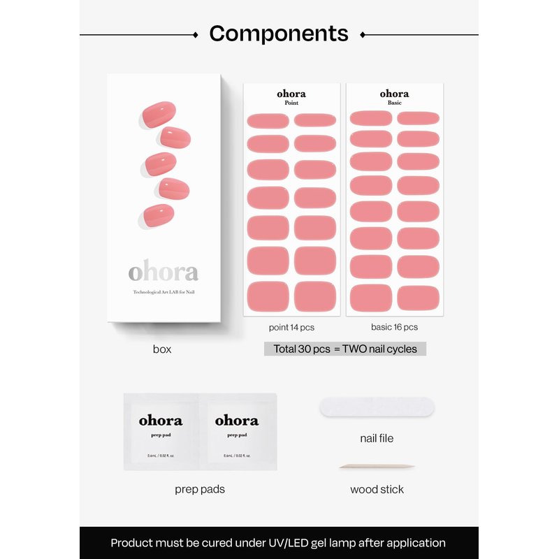 Worried about the color chipping off? Don’t be! Each gel nail is designed with three layers: the base gel, color gel, and top gel. The base gel is used to protect your nail beds. The color gel gives off that eye-catching design, while the top gel preserves the design of the polish. For the best results, we recommend curing your gel nails under ohora’s LED Gel Lamp (not included).
