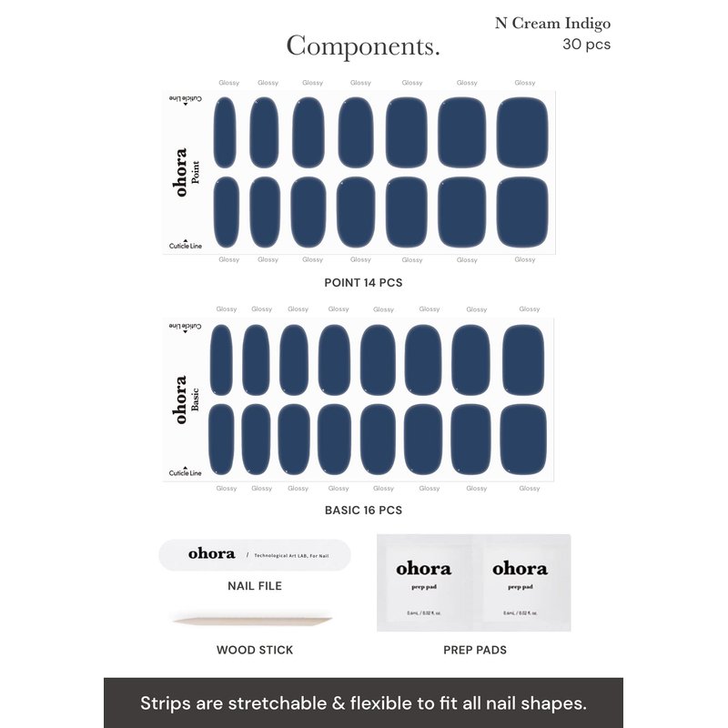ohora Semi Cured Gel Nail Strips (N Cream Indigo) - Blue, Solid, Works with Any UV/LED Nail Lamps, Salon-Quality, Long Lasting, Easy to Apply & Remove - Includes 2 Prep Pads, Nail File & Wooden Stick
