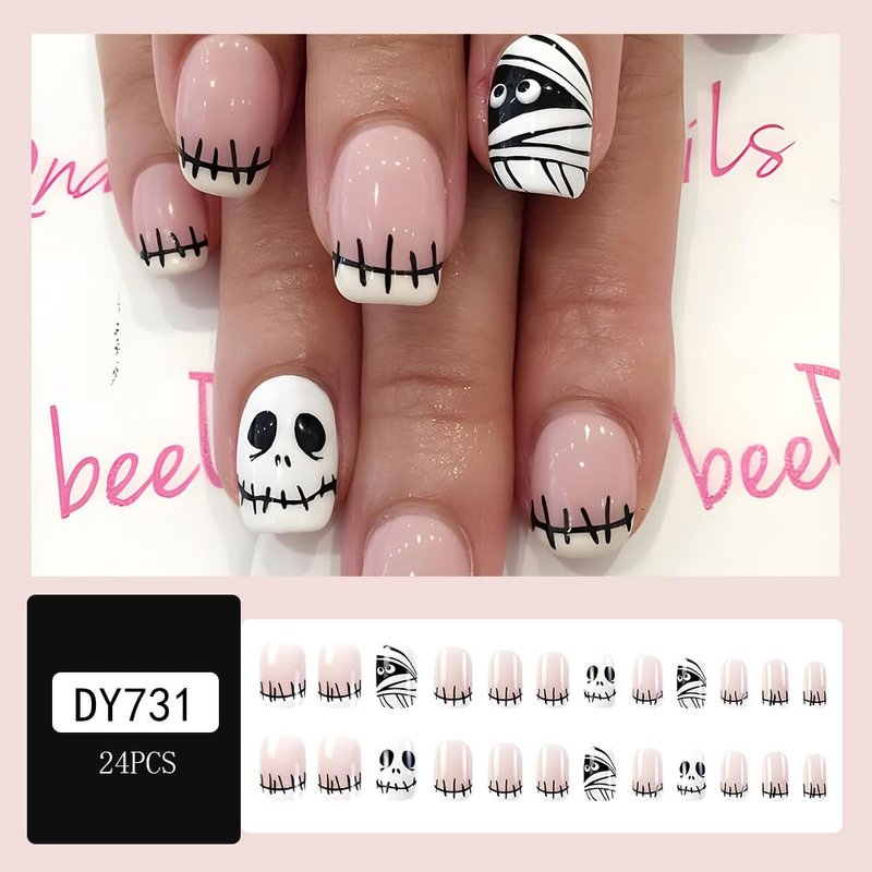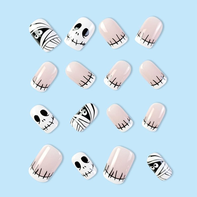 OHWODA 24Pcs Halloween Press on Nails Short Mummy Design Fake Nails Square Shape Glue on Nails Full Cover Odd Halloween Skull Nails Short Stick on Nails for Women Girls Halloween Day Nail Art Decor