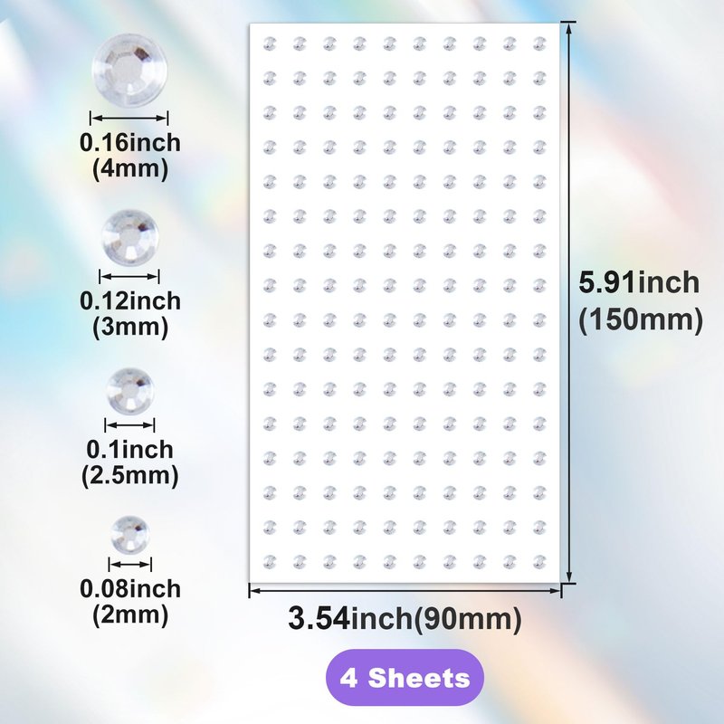 - Package Contains: There are 4 face gems hair jewels in the package, each containing 450 pcs, and you will receive a total of 1800 gem stickers. There are 4 different sizes - 2 mm, 2.5 mm, 3 mm, 4 mm. Sufficient quantity and different sizes to meet your daily needs