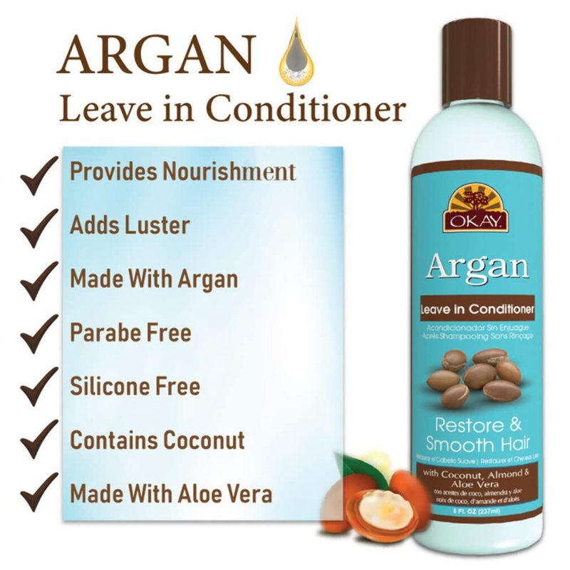 OKAY | Argan Leave In Conditioner | For All Hair Types & Textures | Restore, Hydrate & Smooth Hair | With Coconut, Almond, & Aloe Vera | Free Of Parabens, Silicones, Sulfates | 8 Oz