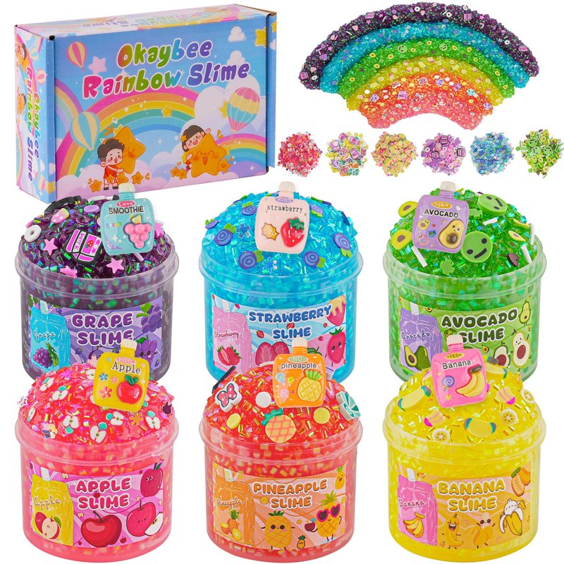 Okaybee 6 Pack Bingsu Crunchy Slime Kit, Rainbow Slime for Kids, with Cute Slime Charms & Add-ins, Slime Party Favors Sensory Toys, Holiday Birthday Easter Hallowmas Christmas Girls Gift & Boys Gift