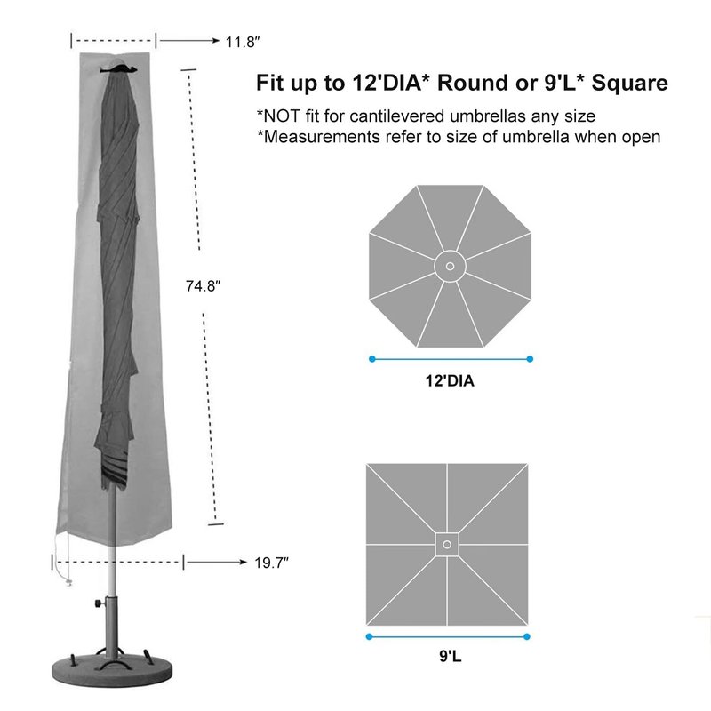 - Durable Umbrella Cover: Made from sturdy thicken heavy-duty material, with PU and silver coating, protect your umbrella from dust, bugs, cracking, fading, tearing and mold growth. Guaranteed to fit large market umbrella up to 12 ft DIA (Round) or 9 ft L (Square), but can NOT fit for cantilevered umbrellas any size.