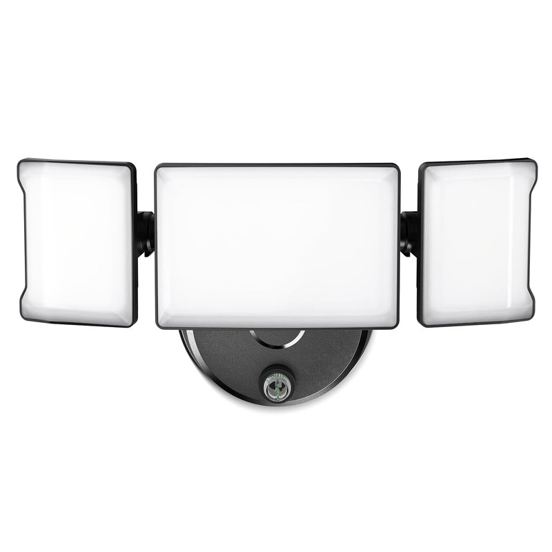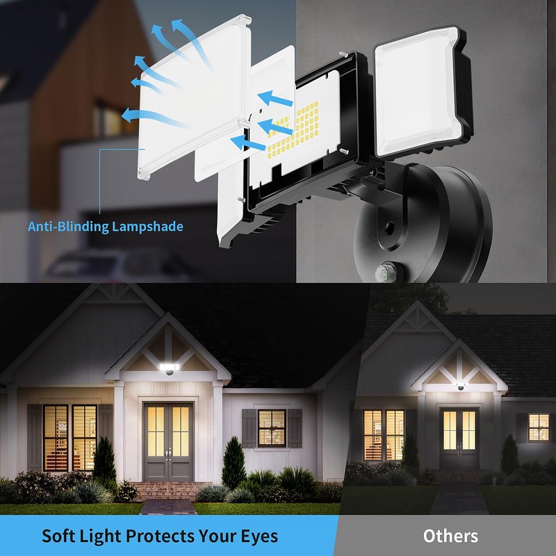 - 【Max 360° Coverage】Three heads adjustable design, 355° for up and down, 90° for side to side, totally reach 360° no dark gaps. Wider coverage than traditional single/dual head floodlights. Especially when installing under the eaves or at some corners, you can rotate the light head to extend the lit area.