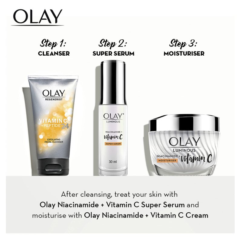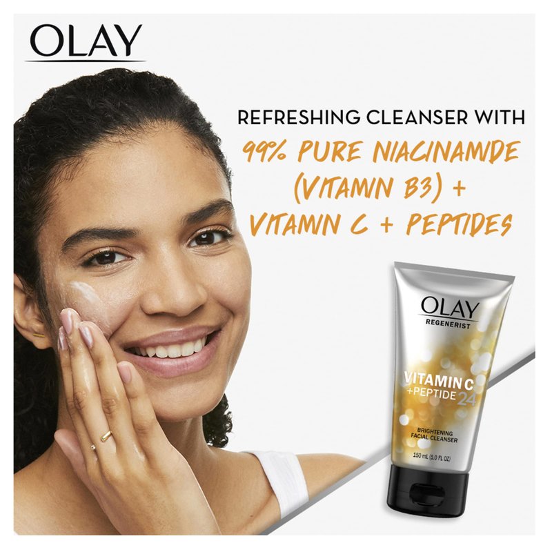 Renews skin's surface olay's refreshing cleanser, with vitamin B3+, vitamin C and peptides, exfoliates to brighten dull skin to prep for your other vitamin C + peptide 24 products. No parabens, phthalates, synthetic dyes, mineral oil. olay.com. www.pg.com. For more information, visit www.olay.com. Questions? 1-800-285-5170. Manufactured in USA from local an imported ingredients.