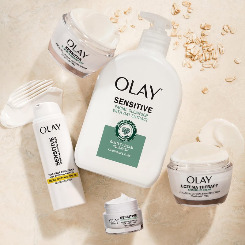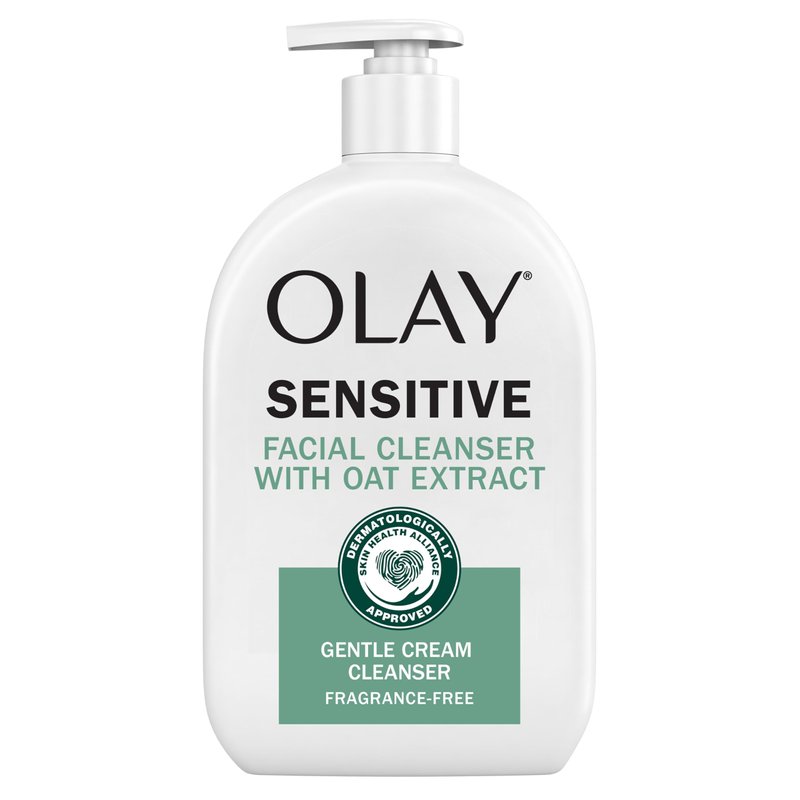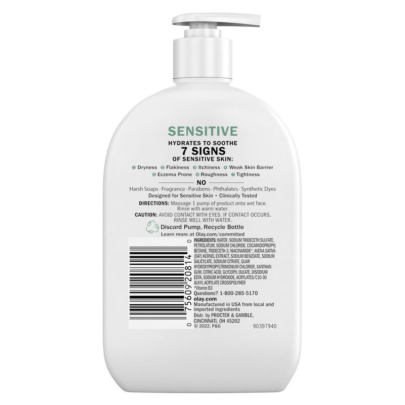 - GENTLE Cleanser: The OLAY Sensitive Facial Cleanser with Oat Extract delivers a gentle clean, and hydrates to soothe seven signs of sensitive skin: dryness, flakiness, itchiness, weak skin barrier, irritation, and tightness