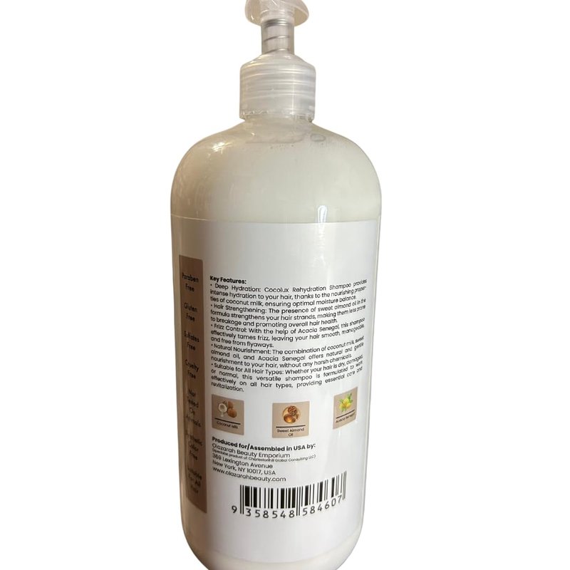 OLAZARAH Cocolux Rehydration Shampoo with Coconut Milk & Sweet Almond Oil - All Hair Types - Sulfate-Free, 32 Fl. oz (with pump)
