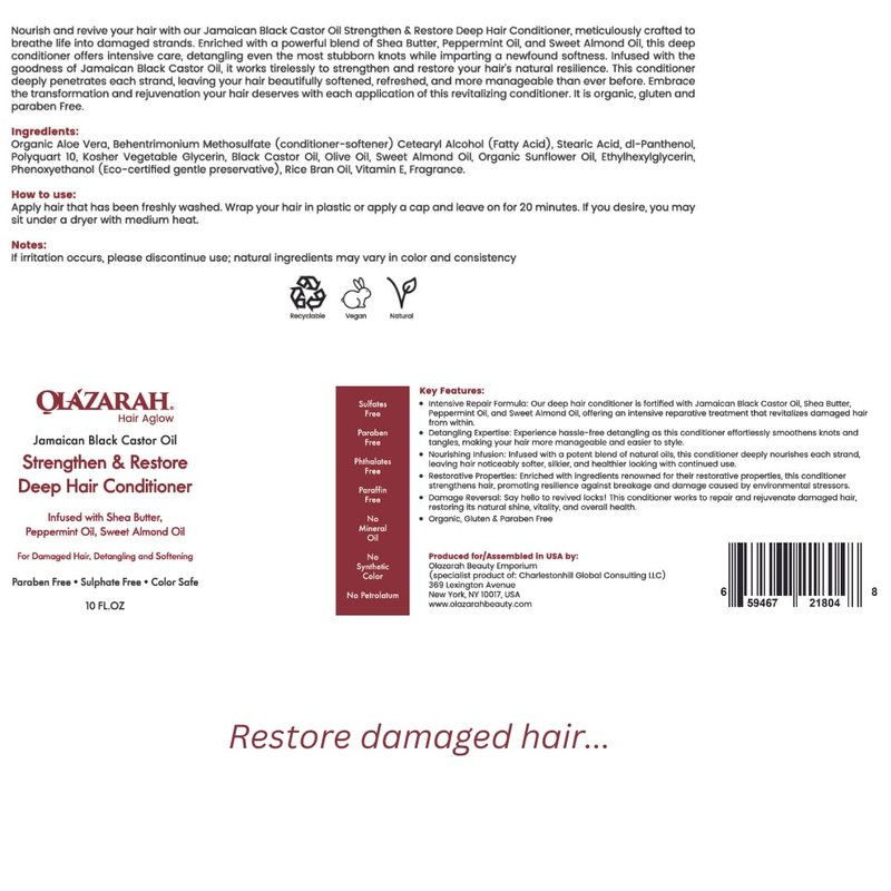 OLAZARAH Jamaican Black Castor Oil Strengthen & Restore Deep Hair Conditioner Infused with Shea Butter, Peppermint Oil, Sweet Almond Oil for Damaged Hair, Detangling and Softening, 10 Fl. oz