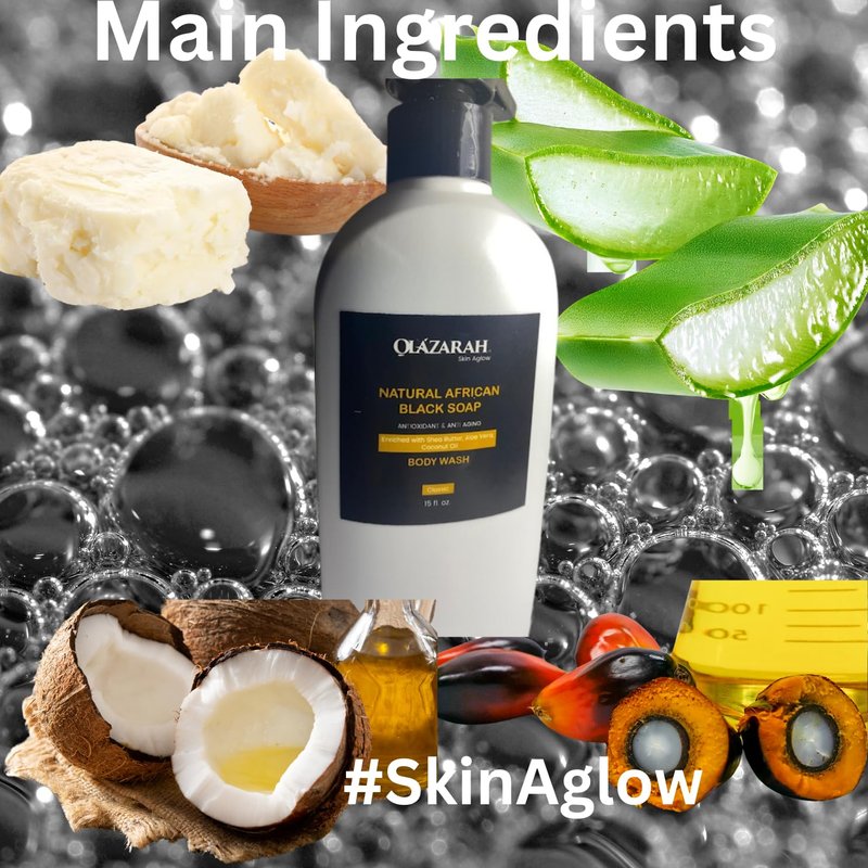 OLAZARAH Natural African Black Soap Body Wash: Acne Treatment & Anti-Aging Enriched w/Organic Shea Butter, Aloe Vera, and Coconut Oil for Glowing & Moisturizing Skin | 15 Fl. oz.