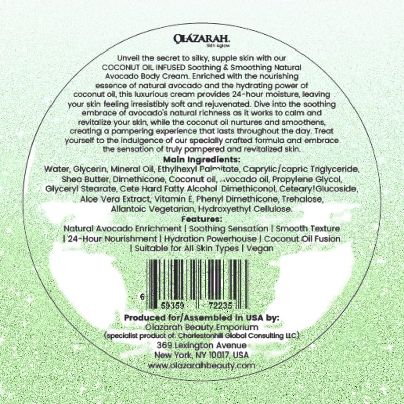 OLAZARAH Skin Aglow Hydrating Avocado & Coconut Oil Infused Body Cream - Natural 24-Hour Moisturizer for Nourished, Silky Smooth Skin, 10 Fl. oz