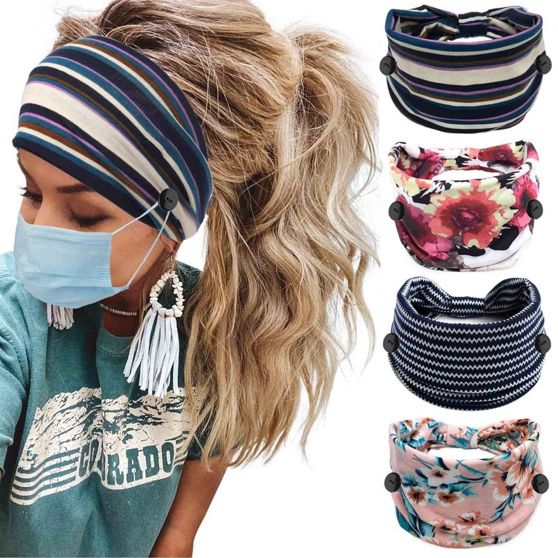Olbye Nurse Headbands with Buttons for Mask Wide Boho Head Bands Knotted Turban Headband Non Slip Elastic Hairbands Workout Head Wraps Yoga Hair Scarfs Bohemian Hair Accessories for Women Girls 4Pcs