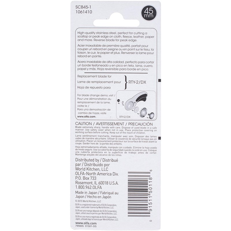 - COMPATIBLE WITH 45mm ROTARY CUTTERS - Our SCB45-1 45mm Rotary Scallop Blades are compatible with most 45mm rotary cutters. However, these circular blades perform best when paired with the OLFA 45mm Ergonomic Rotary Cutter (RTY-2/DX or RTY-2DX/PBL).