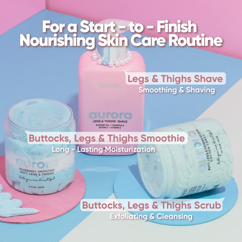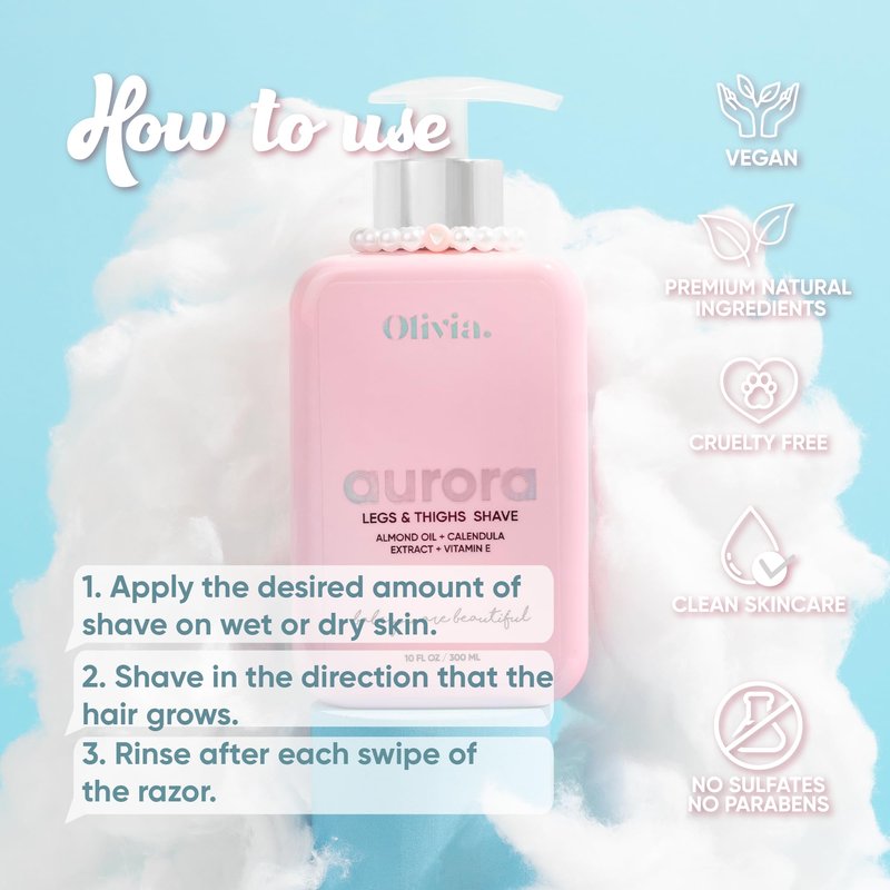 - SHAVE WET OR DRY - Olivia Aurora Legs & Thighs Shave with your own personal care product that works perfectly both ways; Rinse or leave it on for incredibly soft skin that also helps prevent nicks and cuts. Get your skin beautiful, soft, fresh and smooth