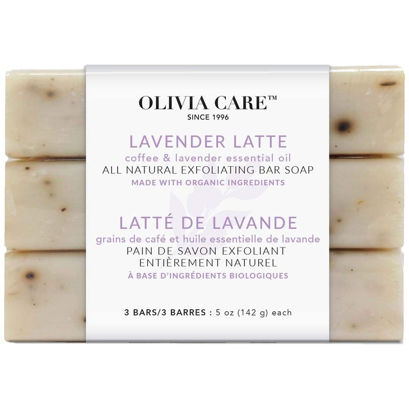 Introducing OLIVIA CARE Exfoliating Bar Soap Lavender Latte 3 Pack—a natural and organic cleansing experience. Infused with Coffee Bean and Lavender Essential Oil, each 5 oz bar offers a rejuvenating exfoliation.