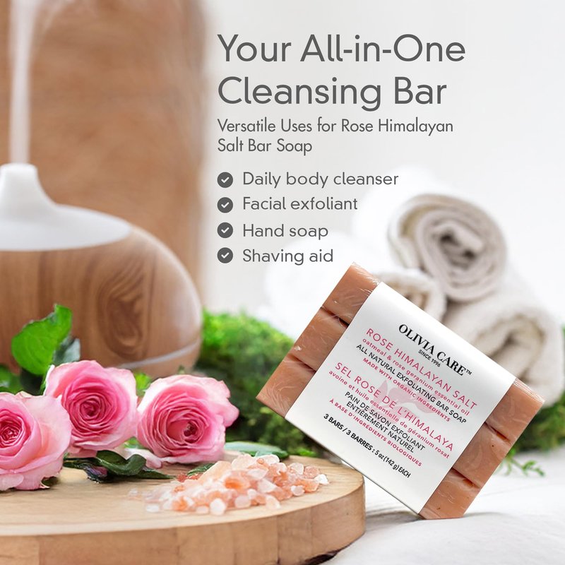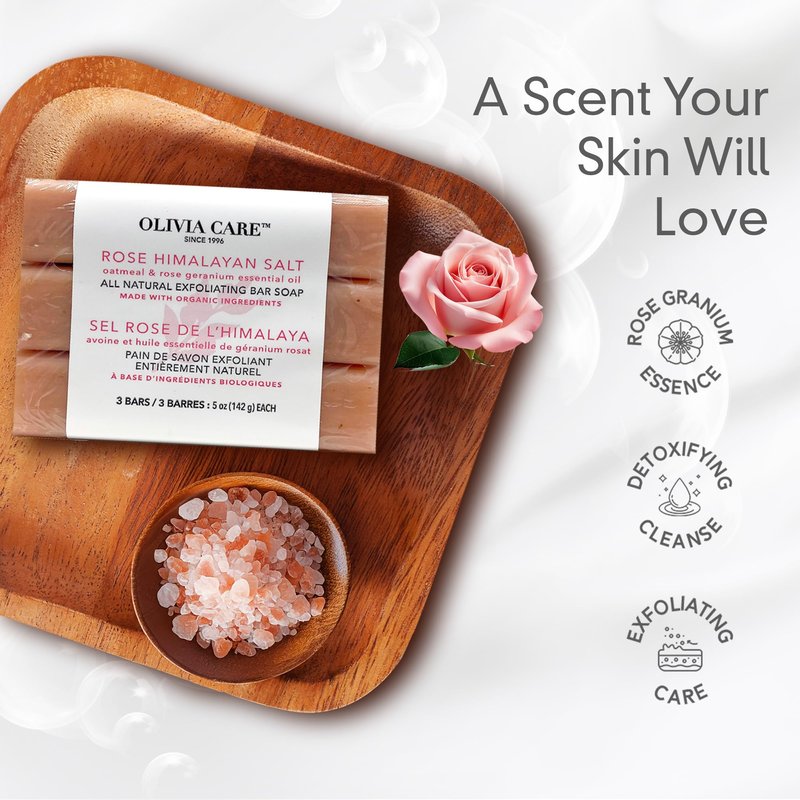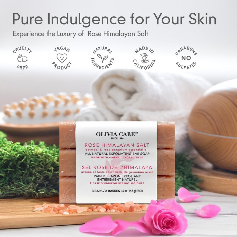 Olivia Care Exfoliating Bar Soap With Rose Himalayan Salt Natural & Organic - Infused w/Oatmeal & Rose Essential Geranium Oil - Moisturize, Detoxify, Hydrate - 3 X 5 OZ