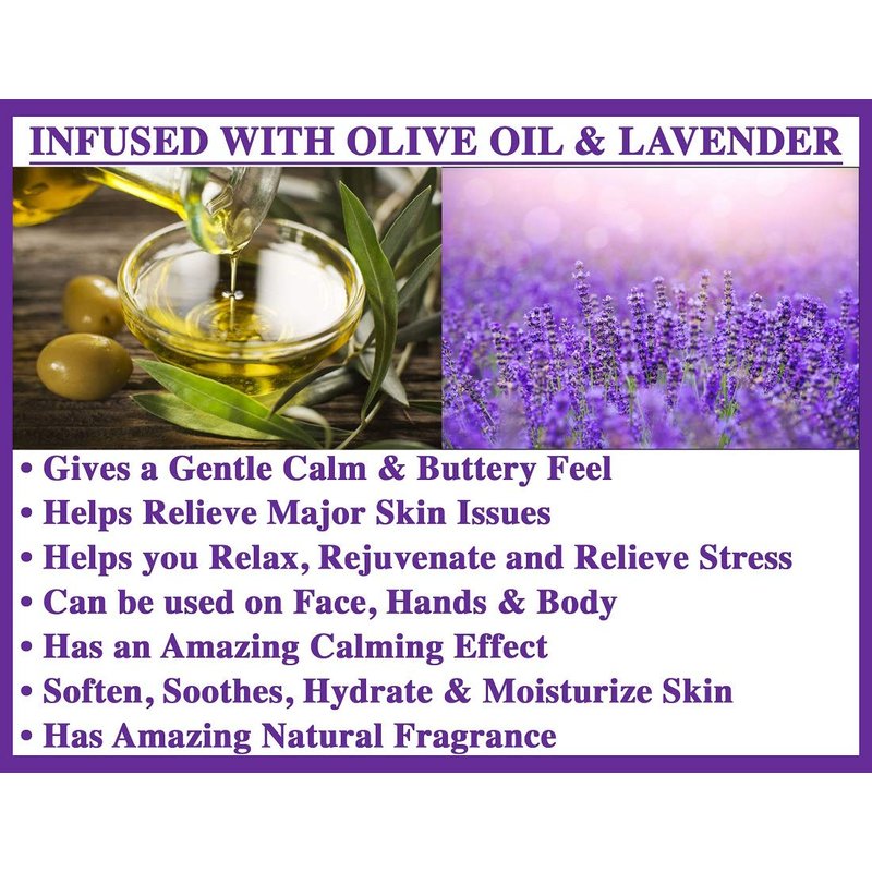 - INFUSED WITH OLIVE OIL & LAVENDER: Olive oil is known to be a perfect skin Moisturizer and gives a very clean and buttery feel. It gives a very gentle and clean feel to skin and help in relieving Eczema and Psoriasis and Acne.Lavender scent has the perfect fragrance which helps in reducing stress, rejuvenate skin and provides relief from insect bite effects.