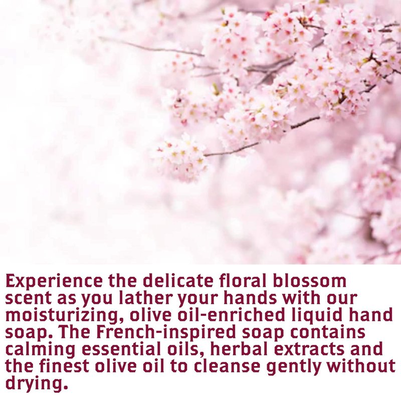 - ✅ INFUSED WITH BLOSSOM & ESSENTIAL OILS: Experience the delicate floral blossom scent as you lather your hands with our moisturizing, olive oil-enriched liquid hand soap. The French-inspired soap contains calming essential oils, herbal extracts and the finest olive oil to cleanse gently without drying.