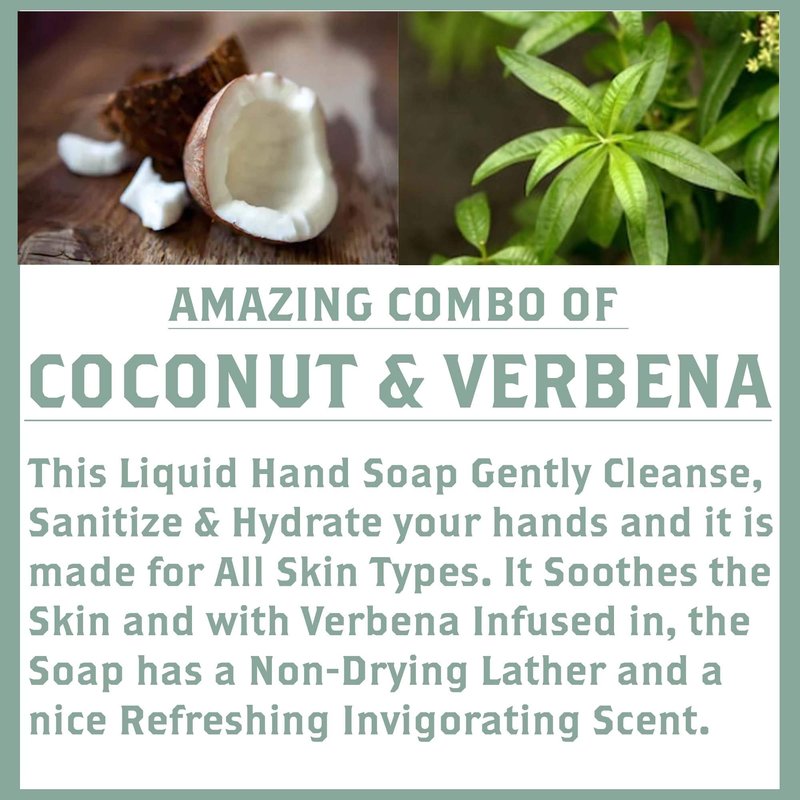 - ✅ INFUSED WITH COCONUT OIL – Using 100% pure coconut oil, this vitamin rich formula will leave your hands feeling silky and smelling divine. Enjoy the fresh, invigorating scent of verbena as you lather your hands with our hydrating liquid hand soap.