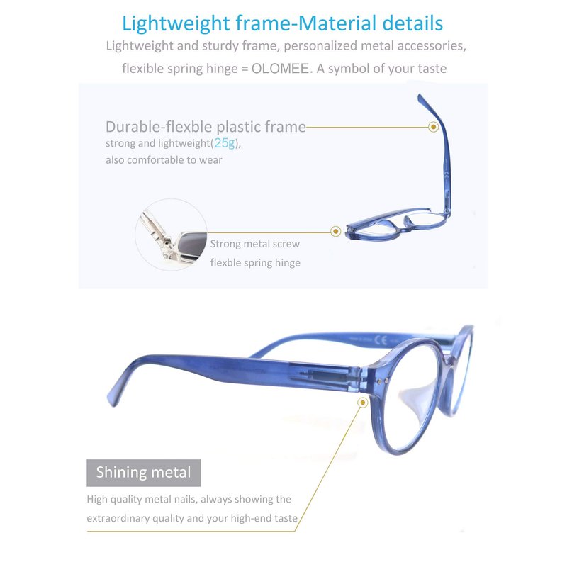 - šćLightweight Readersć-Durable and Felxible,you can barely feel its presence,comfortable to wear for a long time.Round Classic design,high grade of frames resin lens.OLOMEE help you decorate your day!