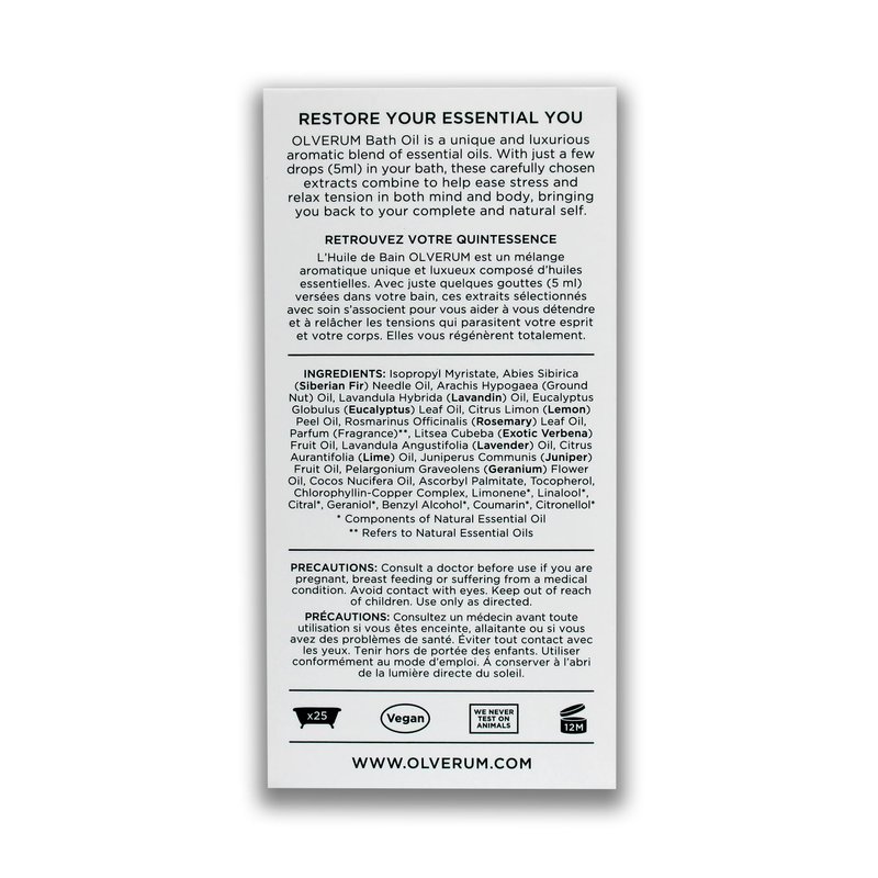 Olverum Bath Oil is a unique and luxurious aromatic blend of carefully selected essential oils which combine to ease stress and relax tension in both mind and body. Our closely guarded formulation of natural plant extracts, each with their own traditional therapeutic properties, promises a truly meditative and uplifting experience to restore the essential you. OLVERUM Bath Oil is vegan and cruelty-free, free from artificial preservatives, fragrance and colorants, Silicone, Mineral Oil, Petrolatum, Sulphates, Parabens, Triclosan and animal derived ingredients.