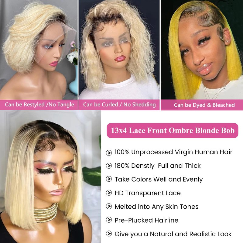- 【Bob Wig Human Hair Material】:1B/613, Ombre Blonde Lace Front Wigs Human Hair Short Bob Wig made of 100% unprocessed Brazilian virgin human hair, collected from healthy young girls, the raw material without any chemical process. Bouncy,soft, smooth, full and healthy ends without dryness or any splits. No shedding and tangle-free, can be dyed, straightened, curled and permed.