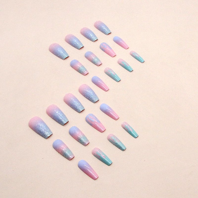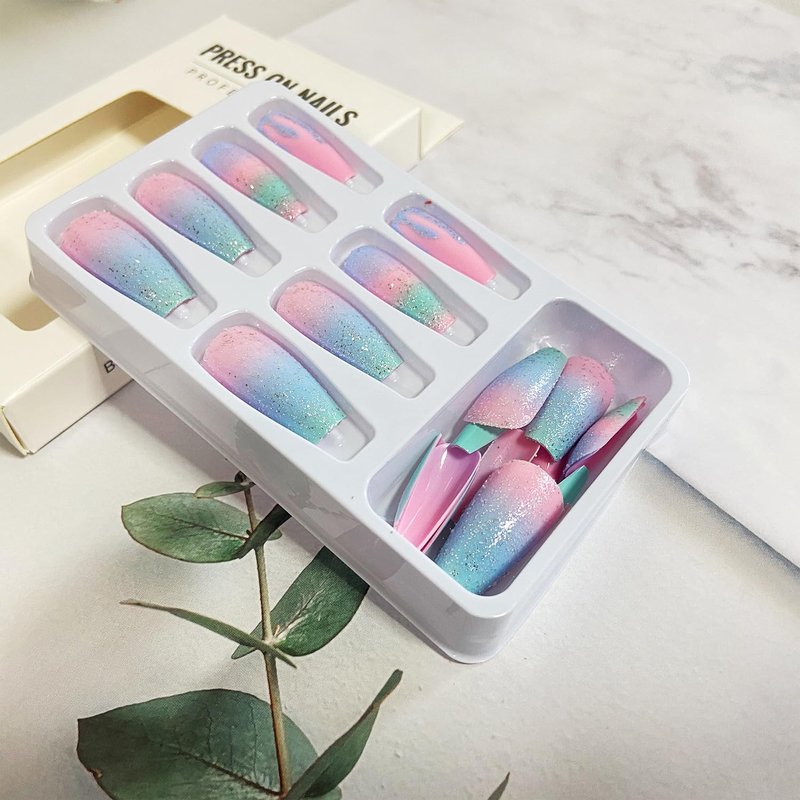 - 【Easy to Use】: Choose the suitable fake nails with pink blue gradient designs, polish the nail bed, paste the jelly glue we give you, press the fashion nail art in 30 seconds, and create the nail art that girls like,If the size is not suitable, it can be polished to the size of the nail cap with a friction tool.