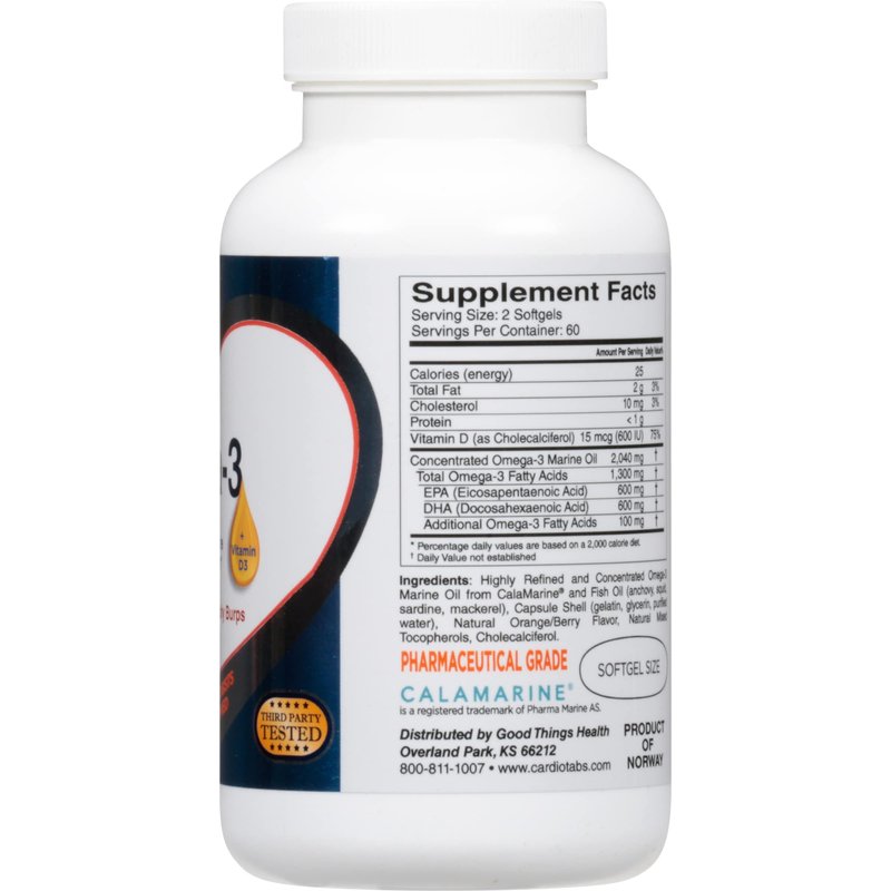 Cardiotabs Extra Strength Omega 3 + Vitamin D3 is an excellent quality, nutrient-rich fish oil supplement with a grand total of 2040 mg of concentrated omega-3 marine oil—1,200 mg DHA + EPA, and other additional Omega-3 fatty acids and vitamins per serving that are the key ingredients for eye, cognitive, joint, and cardiovascular performance—particularly for those men and women who enjoy an active lifestyle. This is an easy-to-swallow citrus berry-scented and flavored softgel that is highly absorbent for the body. Expertly formulated to ensure excellence in every 120-count bottle, good for 2 months supply of nutritional benefits from omega-3 fish oils. Take two (2) softgels daily or as your healthcare provider recommends, preferably with meals. FREE from yeast, wheat gluten, milk or dairy, sodium, sugar, and artificial coloring or preservatives. Manufactured in the United States and third-party laboratory tested for purity and potency.
