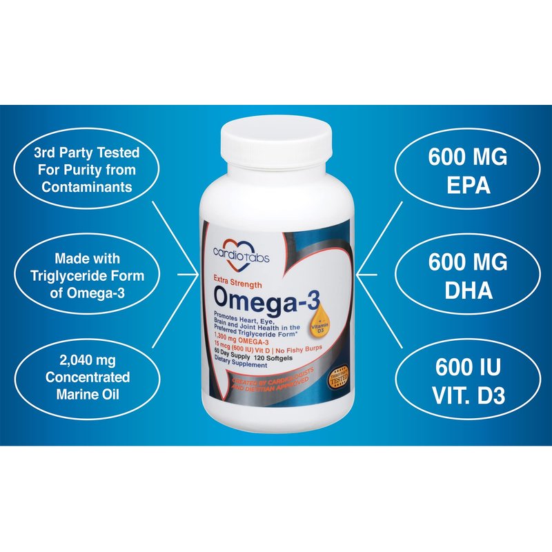- POTENT OMEGA-3 SOFTGEL: Cardiotabs Extra Strength Omega-3 + Vitamin D3 is a potent, high-absorbent softgel made with triglyceride omega-3, which comes from a concentrated marine oil and is an excellent source of EPA and DHA and key fatty acids great for eye, cognitive, joint, and cardiovascular performance—particularly for those who enjoy an active lifestyle.