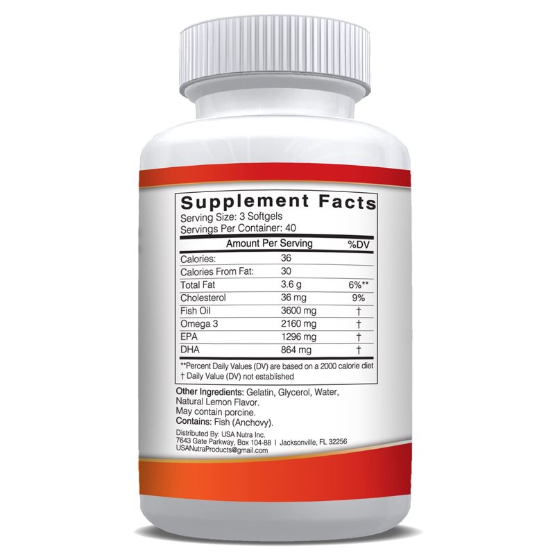Each daily serving of three soft gels of this extra strength concentrated formulation provides 3600mg of ultra pure natural fish oil with a huge 1350mg of EPA and 900mg of DHA, a total of 2250mg of healthy Omega-3 every day!