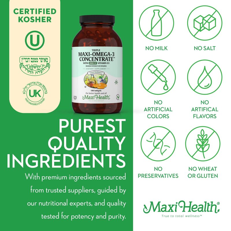- WILD-CAUGHT & KOSHER : Every batch of Maxi Health omega3 fish oil supplements is crafted from fresh, wild-caught ocean fish rich in omega 3 fatty acids. Kosher Certified by the Udvari Kashruth (UK), the Orthodox Union (OU), and the Badatz.
