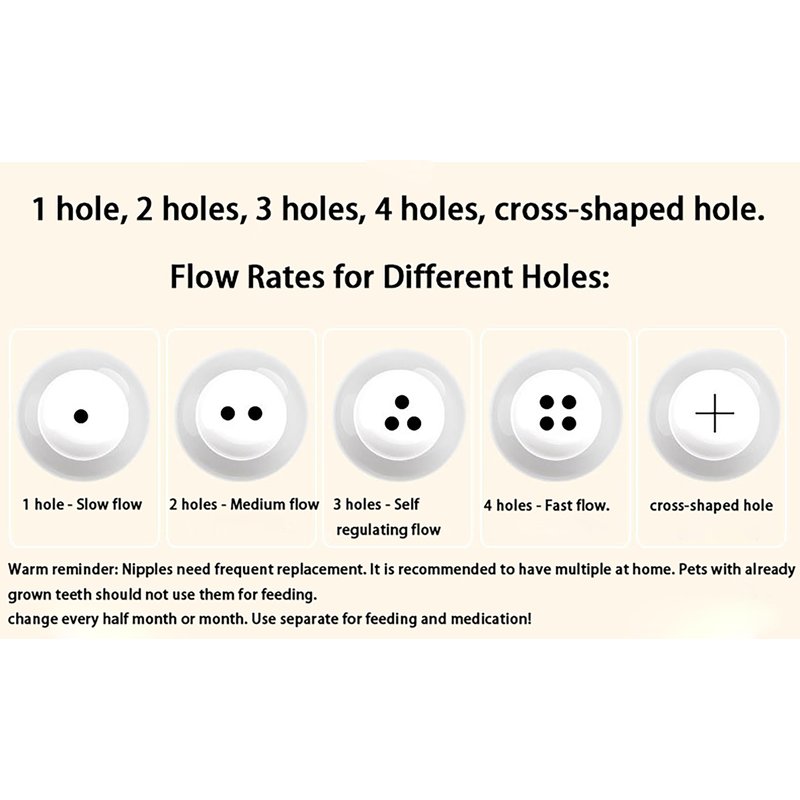 - Nipple without holes, pacifier needs oneself with a needle open hole, because it can control food intake, prevent excessive feeding, lead to diarrhea. When the pet is sick, use a separate dedicated pacifiers, avoid cross-infecting other pets.