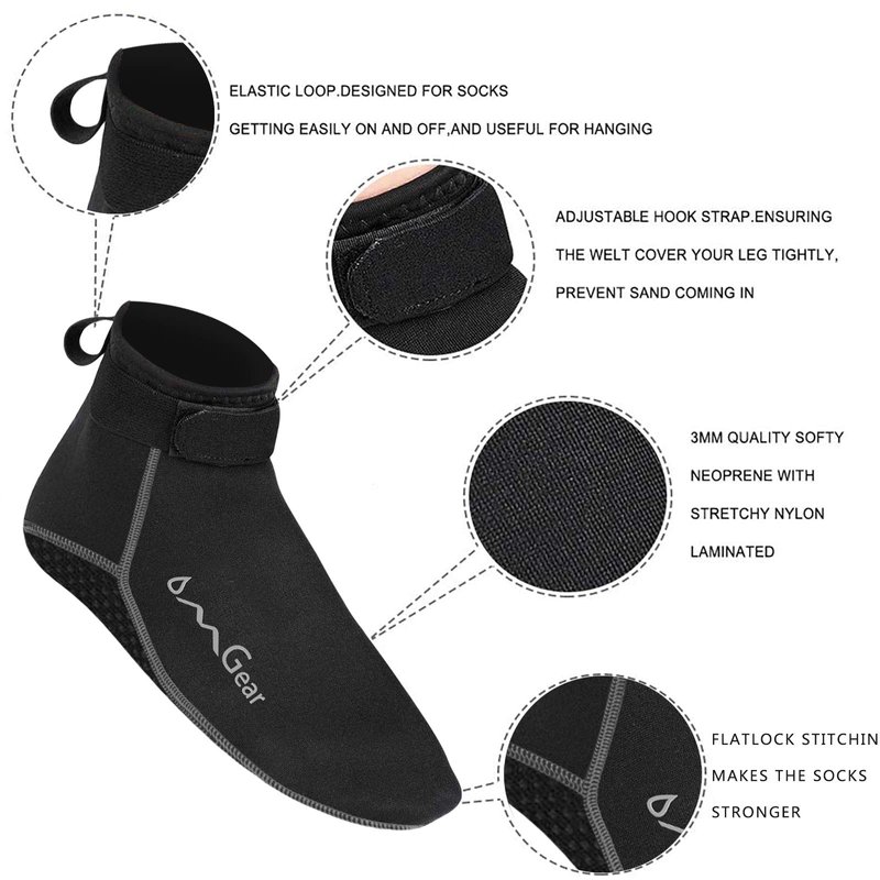 Wear your OMGear neoprene socks for any beach,sand,water or sports activities,your feet will be comfortably protected !Quality,softy,elastic and durable materialsOMGear water socks are made by quality softy neoprene with 4-way stretchy nylon laminated,providing comfortable and flexible using experience.Unisex fit&wide size rangeOMGear neoprene socks is unisex designed,fit for both women and man.Sizes range from US 6 to US 15.abrasion resistant,tearing resistant and anti-slip sole.Reinforced sole with rubber printing can handle any slippery,sandy and rugged using environment.easy on and off.A elastic loop at the heel part of neoprene socks, makes it easy to wear or take off, and easy to hang on at outdoor sport bags or surfboards,diving fins,ect.... adjustable strap prevents sand and small things into the socks. A seal design provide you a bare-feet feeling.Versatile: Our neoprene socks are perfect for water aerobics, surfing, diving,rafting,spearfishing,beach volleyball, pilates, wake-boarding, sailing, swimming, boating, kayaking, windsurfing, cycling jogging, walking, fishing, weight-training,aqua fitness and yoga,even using in water park,garden,lawn or car-washing and driving.What’s more,you can use it as slippers at home. YOUR FEET ARE PROTECTED WITHOUT LETTING YOU FEEL THAT YOU ARE WEARING THE SOCKS.Package:1 pairs neoprene water socks