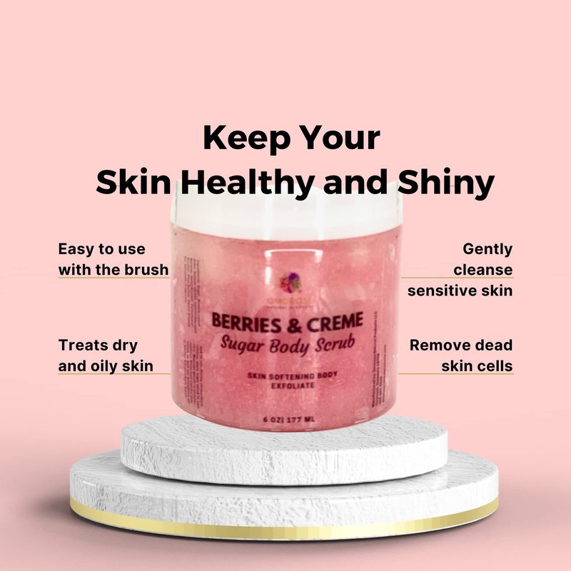 Our Berries & Creme Sugar Body Scrub is amazing! It is scoop-able and is non-greasy. This wondreful sugar scrub will leave your skin feeling soft, smooth and smelling good. Every batch is made with quality ingredients including natural skin nourishing oils and shea butter.