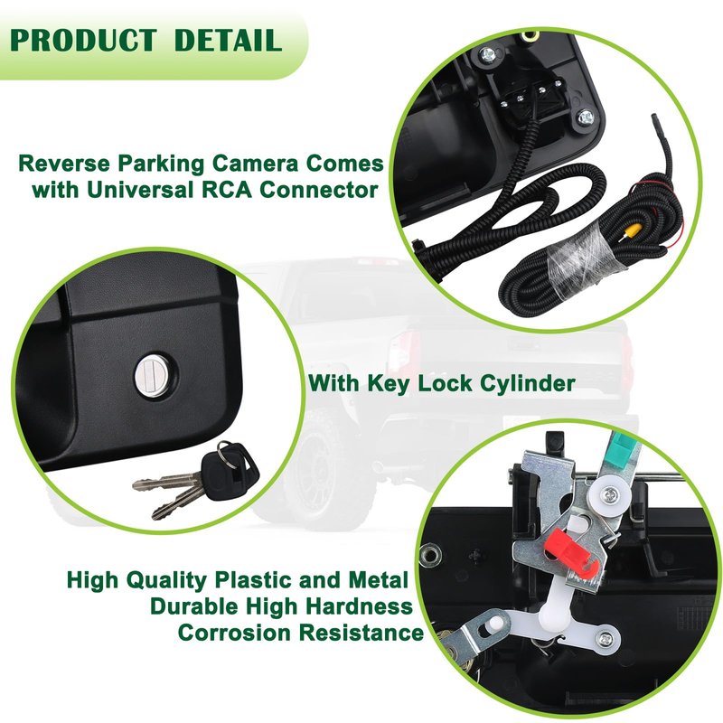 - 🛒【SERVICE LIFE&EASY INSTALLATION】This backup camera tail gate latch handle with key lock cylinder is not the real original parts,but it uses advanced technology and high-quality materials in line with oem standards,more effective extension of service life,our reverse parking camera comes with universal RCA connector,Direct connection to aftermarket surveillance/video receiver,easy to install,can save you time and money