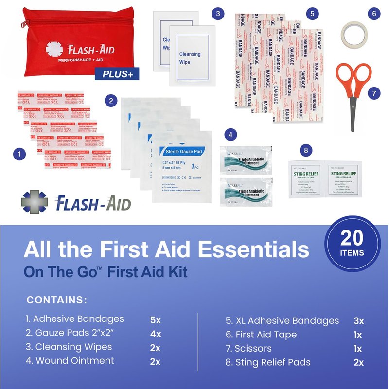 FOR ON THE GO! Easy to Carry - Perfect Size to Fit Nearly Anywhere – Be Prepared When You Are “On The Go!” EVERYTHING YOU NEED + COMPACT TO GO ANYWHERE! This mini travel first aid kit has all of the most used and needed first aid supplies, but gets rid of those things that take up space and no one uses anyway. Small + compact to fit just about anywhere to help you take care of any emergency and be your best! ALL THE FIRST AID ESSENTIALS: Contains 20 Items: Adhesive bandages (5) - XL adhesive bandages (3) - Cleansing wipes (2) - Prep pads (2) - Gauze pads (2) - Sting relief pads (2) – Wound cream (1) - Scissors - First aid tape – all in a reusable, nylon, durable, soft, flexible, zippered pouch BE PREPARED + CARRY WITH YOU WHEREVER YOU GO! Ideal first aid travel kit for carry-on bags, backpacks, purses, sports bags, suitcases, work lockers, desks, vehicles and anywhere you may need first aid supplies. SUPER HANDY + CONVENIENT! Because you never know when a cut or scrape will happen! Useful to put one of these mini kits wherever little mishaps may happen. This mini travel first aid kit is ideal for kid’s school backpacks, camping trips and outdoor adventures, vacations, sporting events, and to have in each of your vehicles! CLEAN + TREAT + PROTECT! CLEAN the wound with the wipes to remove any dirt and debris – TREAT the wound with the antibiotic ointment to prevent infection + PROTECT the wound and help it heal with the adhesive bandages