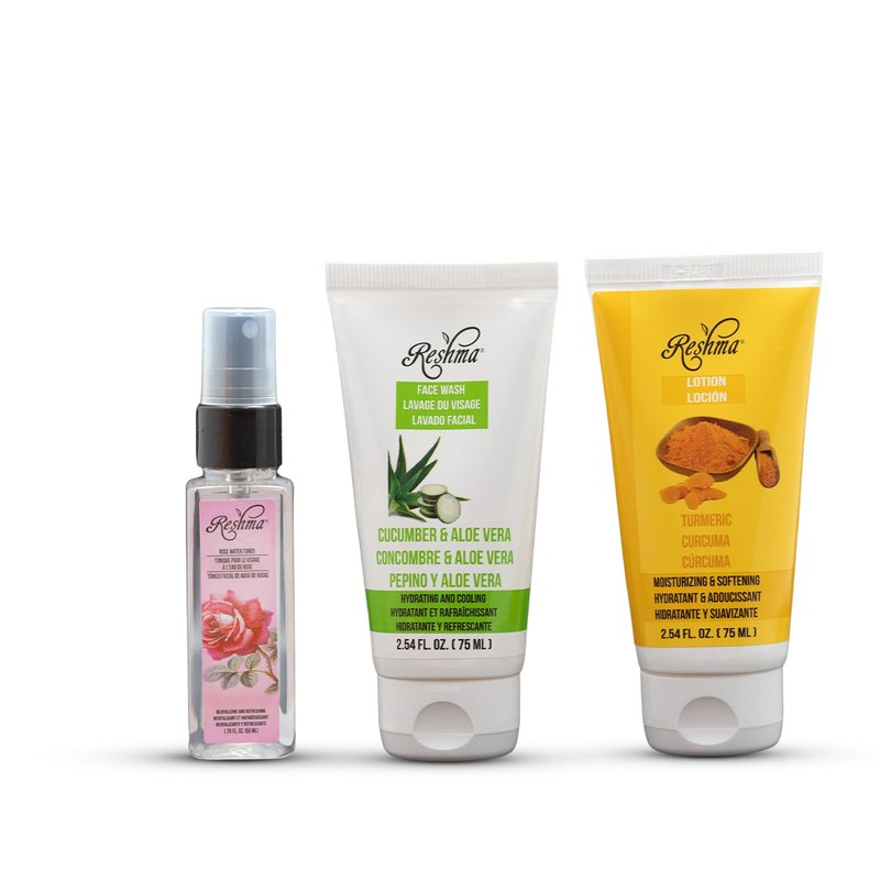 - This set includes one (1) Mini Cucumber & Aloe Vera Face Wash, one (1) Mini Turmeric Lotion, and one (1) Mini Rose Water Toner.