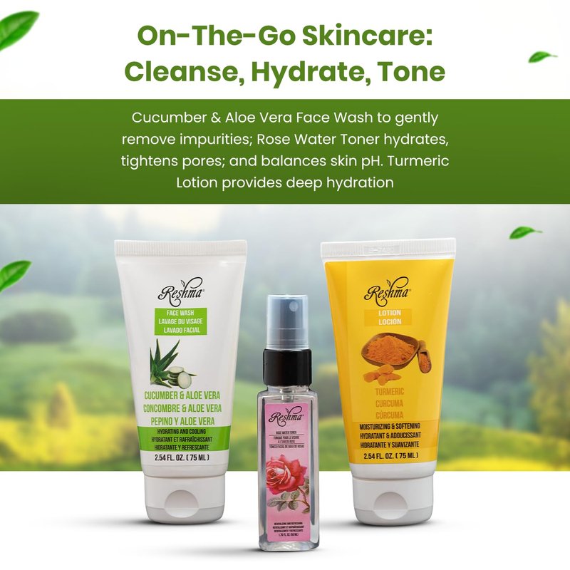 - Experience effortless skincare with our On-The-Go Trio: Cleanse, Hydrate, Tone. Featuring our refreshing Cucumber & Aloe Vera Face Wash, hydrating Turmeric Lotion, soothing Rose Water Toner, this compact set ensures you stay refreshed and radiant wherever you wander.