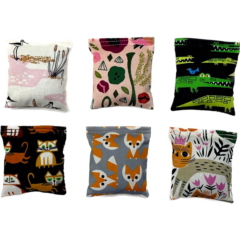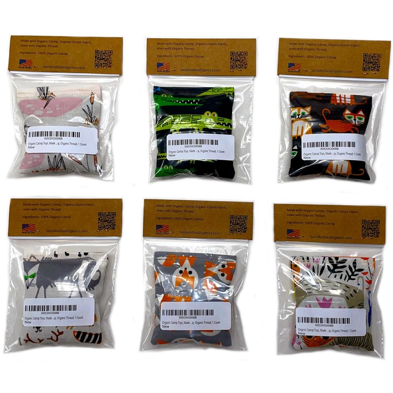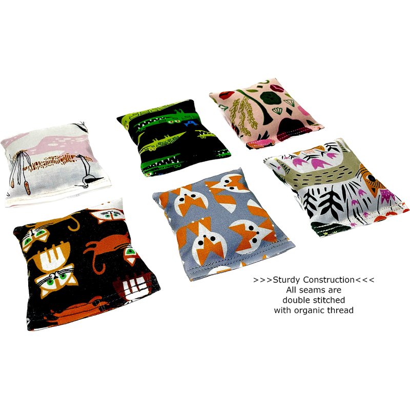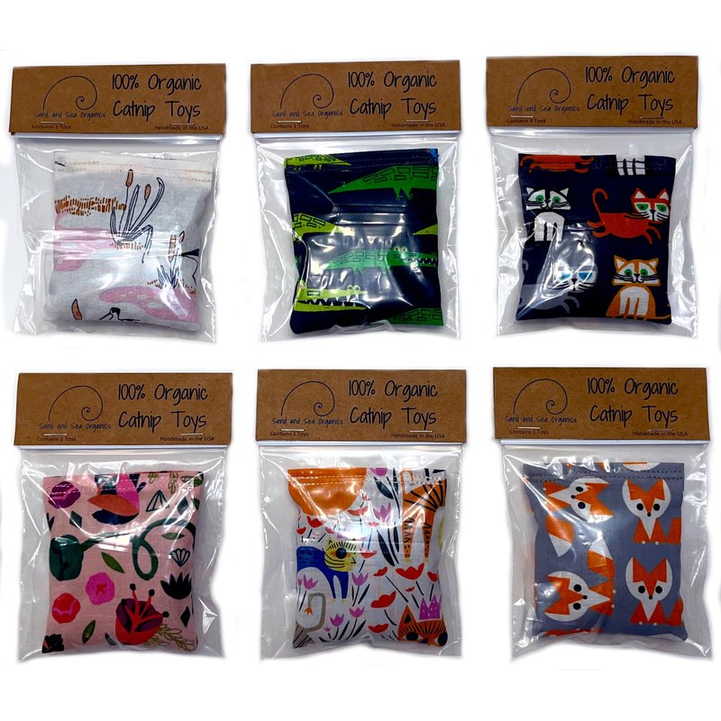 One Organic Catnip Toy from six designs, Made with GOTS Certified Organic Fabric, Organic Catnip, Organic Thread, Handmade in the USA
