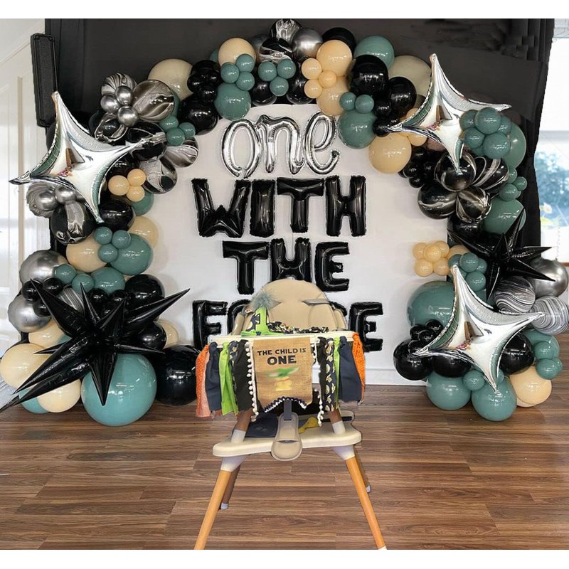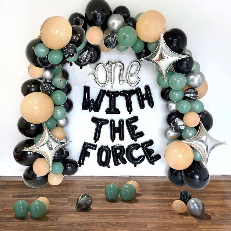 - One With The Force Balloons Sage Green and Black Pastel Orange balloons for Wars Themed Birthday Party Supplies First Birthday with Star Balloon for Themed Birthday