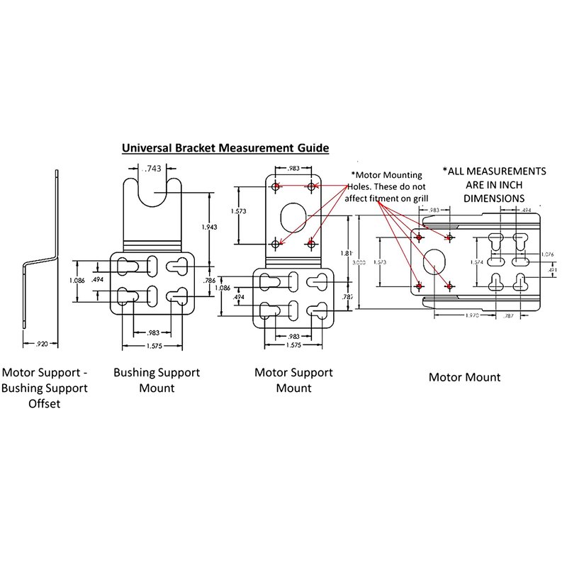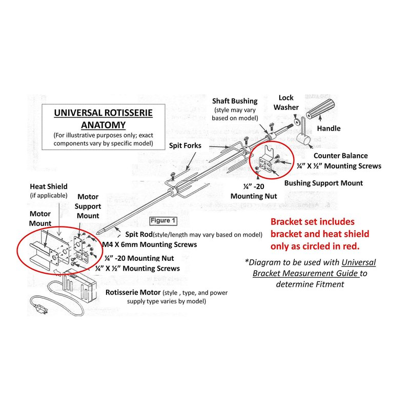 - Universal Style Design Allows For a Multitude Of Applications For Many Commercially Available Grills & Custom Applications. Be sure to review the bracket schematics and "universal rotisserie anatomy" diagram for detailed bracket measurements and basic intended setup in the alternate product images.